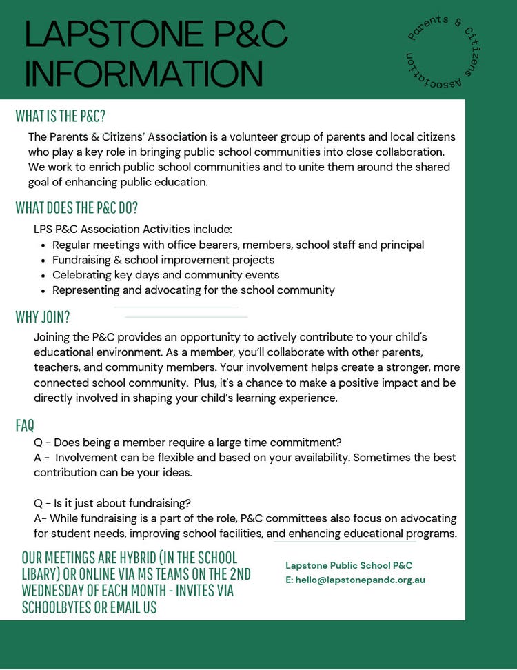 To learn how to join our P&C, contact: hello@lapstonepandc.org.au.